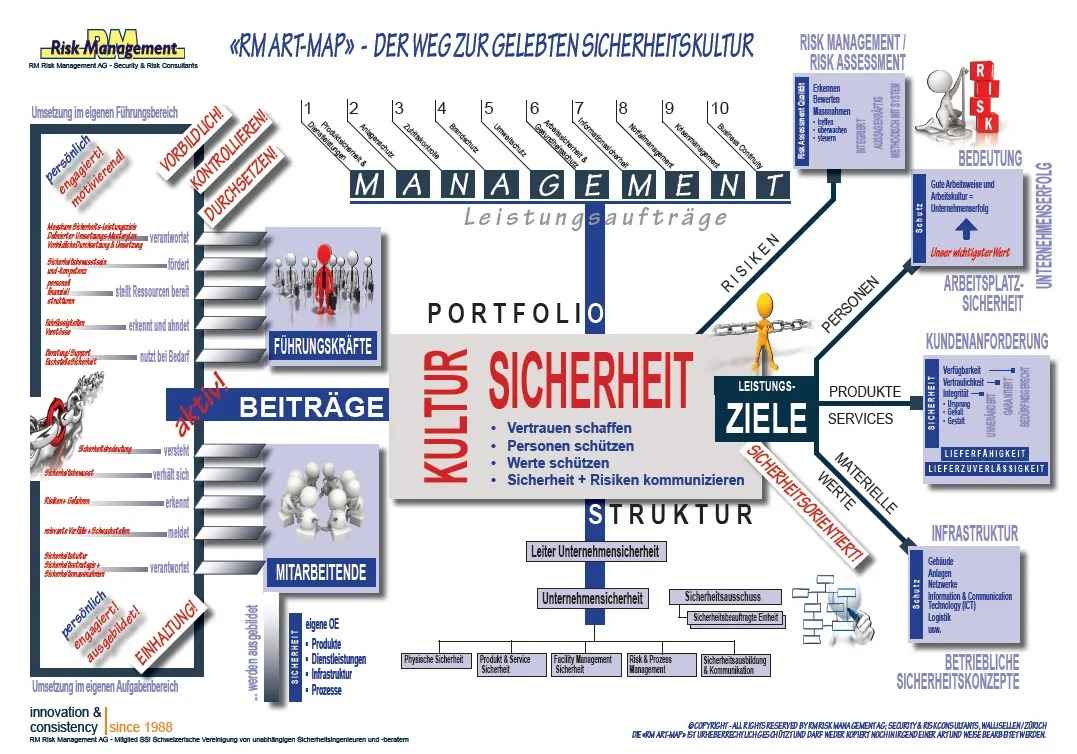Dieses Dokument enthält eine grafische Darstellung (Map), die zentrale Aspekte des Risikomanagements (RM) visuell aufbereitet. Die Abbildung verdeutlicht Zusammenhänge und Strukturen im Bereich Risikomanagement und dient als visuelles Hilfsmittel zur Orientierung.