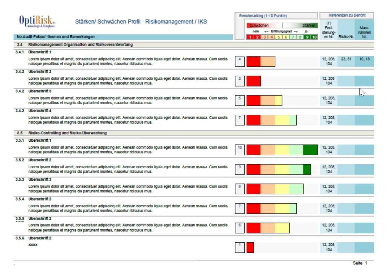 Dieses PDF stellt ein Stärken-Schwächen-Profil im Rahmen eines Risikomanagement-Audits dar. Es identifiziert zentrale Risikobereiche, zeigt bestehende Stärken auf und weist auf mögliche Schwächen hin, die Optimierungsbedarf signalisieren.