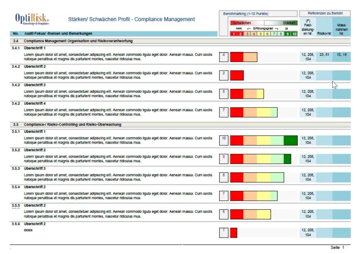 Das Dokument enthält ein Audit-Stärken-Schwächenprofil im Bereich Compliance Management System (CMS). Es dient zur Bewertung von Effektivität und Reifegrad des CMS und zeigt Handlungsfelder zur Verbesserung auf.