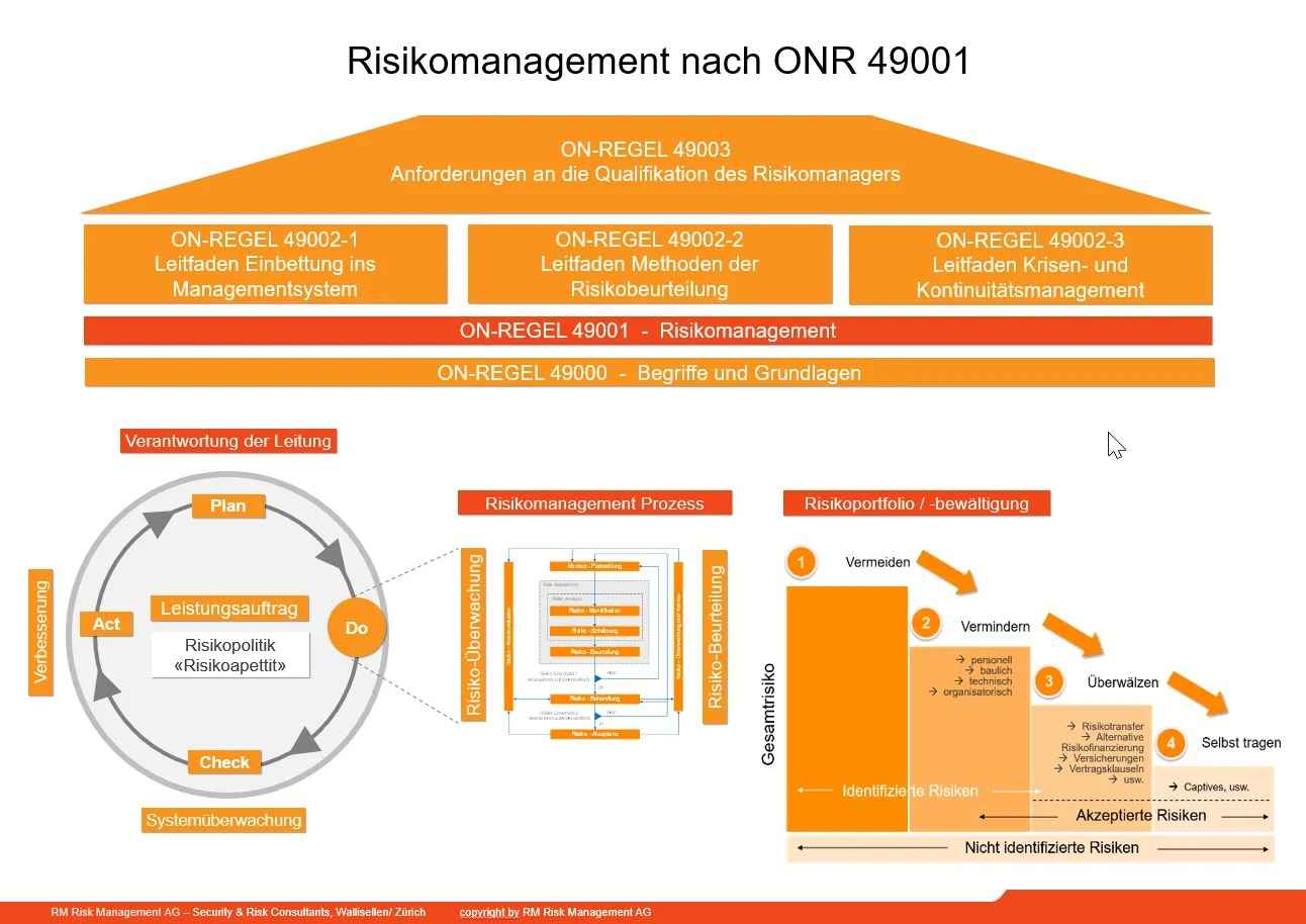 Dieses Dokument erläutert die österreichischen ONR-Normen zum Risikomanagement (ONR 49000–49003). Es beschreibt Prozesse, Qualifikationen von Risikomanagern und Leitfäden für Risikoanalyse, Krisenmanagement und Kontinuitätsmanagement.