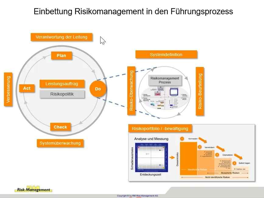 Dieses PDF stellt den Risikomanagement-Prozess dar und zeigt, wie er in den Führungsprozess eingebettet wird. Themen wie Risikoanalyse, Risikoportfolio, Kontrolle und Verbesserung werden im Zusammenhang mit Managementaufgaben erläutert.