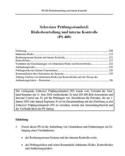 Das Dokument beschreibt den Schweizer Prüfungsstandard PS 400. Es enthält Vorgaben zur Risikobeurteilung und zur Prüfung interner Kontrollen im Rahmen von Abschlussprüfungen, einschließlich inhärentem Risiko, Kontrollrisiko und Aufdeckungsrisiko.
