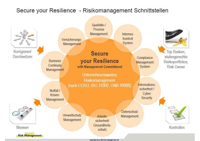 Dieses Dokument beschreibt Schnittstellen des Risikomanagements zu weiteren Managementsystemen. Dazu gehören Compliance, internes Kontrollsystem, Business Continuity, Notfall- und Krisenmanagement sowie Informationssicherheit. Ziel ist es, Resilienz durch integrierte Steuerung zu sichern.