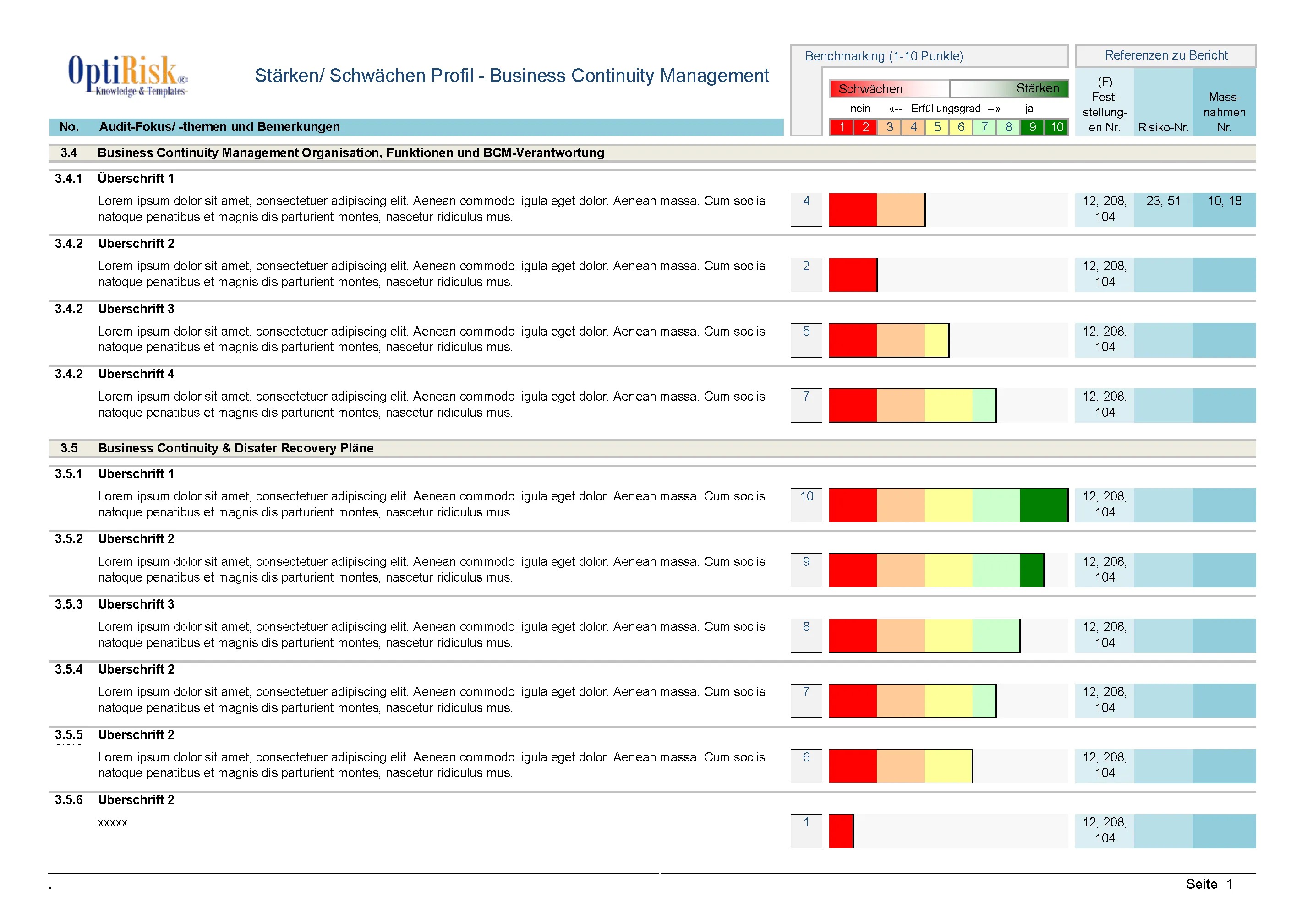 Das Dokument enthält ein Audit-Stärken-Schwächenprofil im Bereich Business Continuity Management (BCM). Es dient zur Bewertung von Effektivität und Reifegrad des BCM und zeigt Handlungsfelder zur Optimierung des Business Continuity Managements auf.