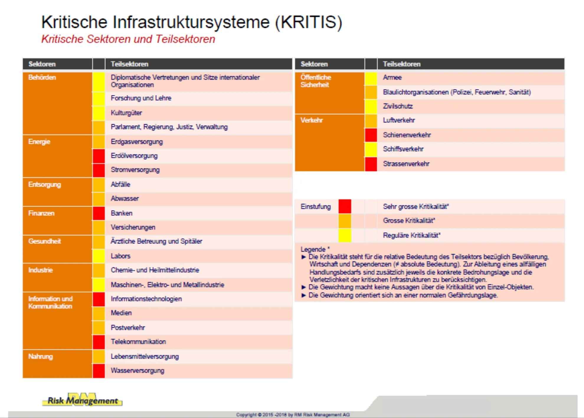 Das Dokument zeigt das Vorgehen zur Umsetzung des Schutzes kritischer Infrastrukturen in der Schweiz. Es beinhaltet Projektorganisation, Risiko- und Verwundbarkeitsanalyse, Bewertung von Schutzmassnahmen sowie deren Umsetzung und Monitoring. Der Ansatz integriert BCM, Krisen- und Notfallmanagement.