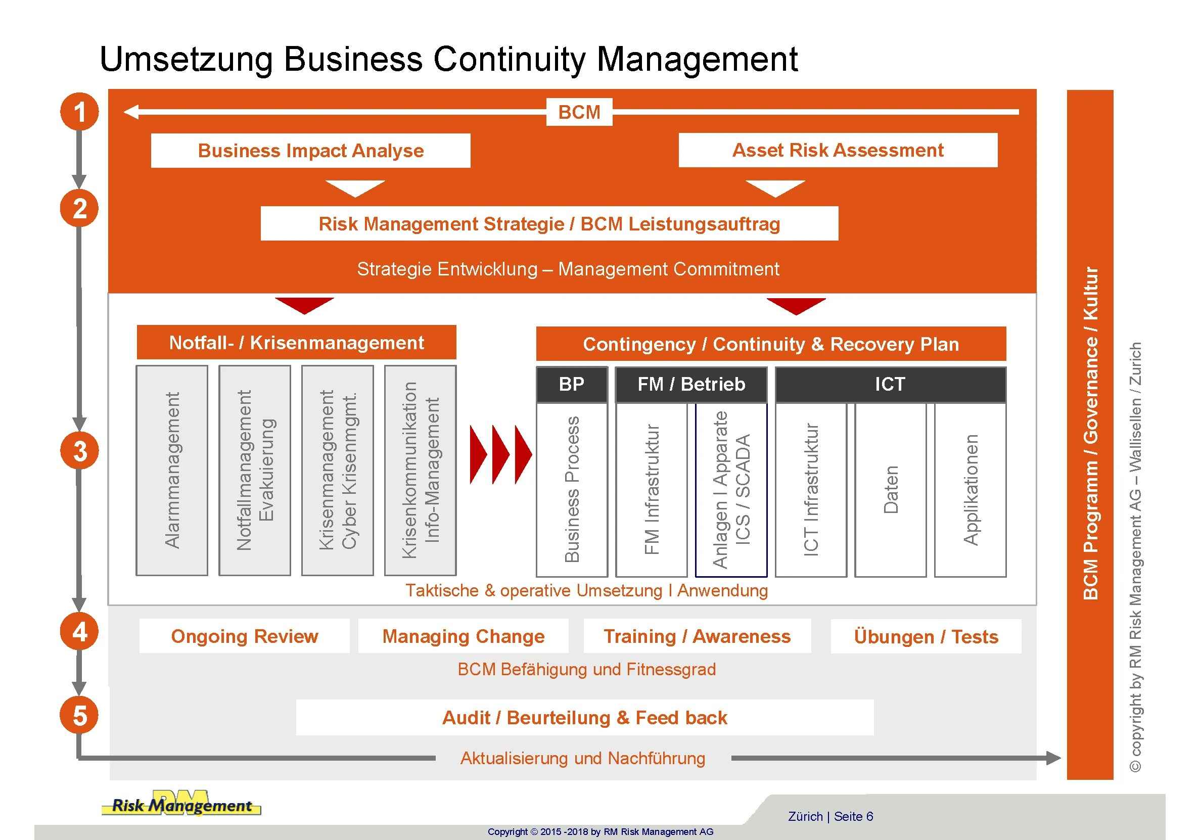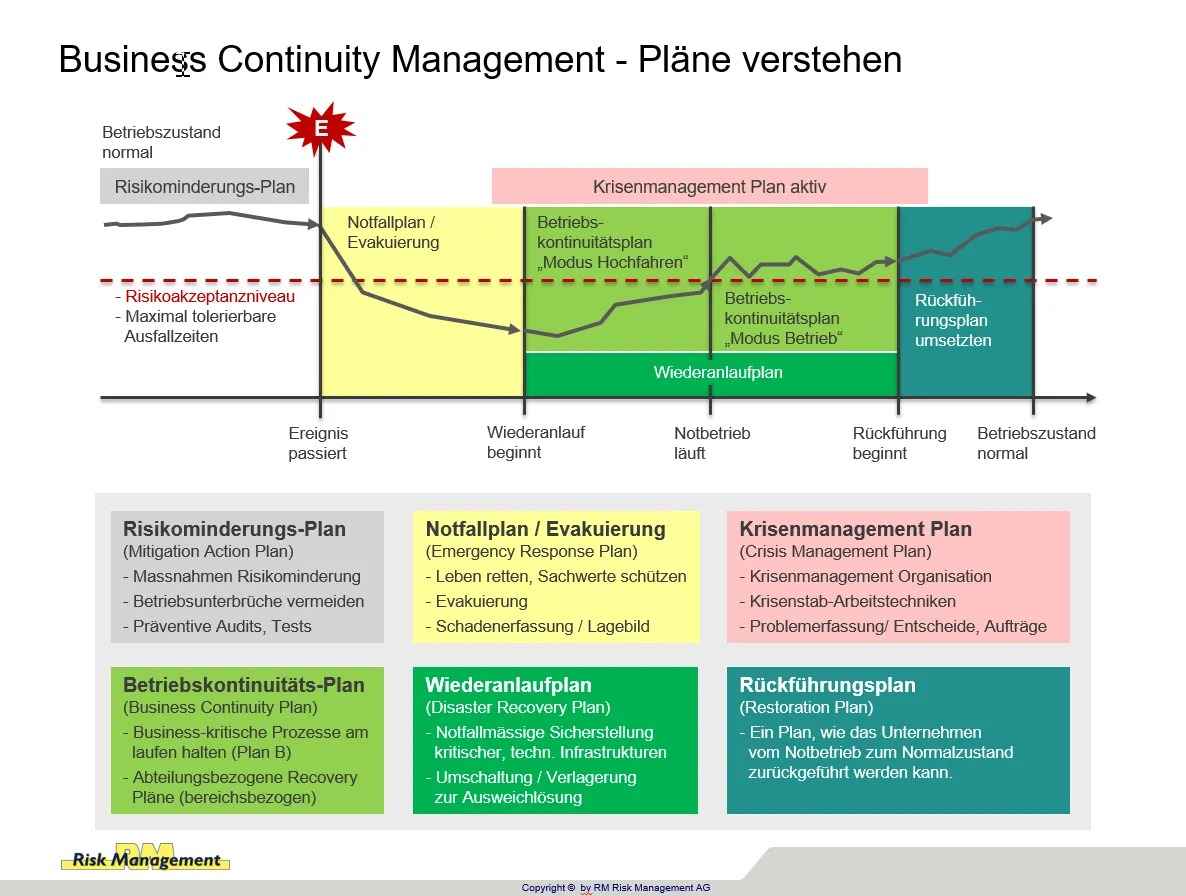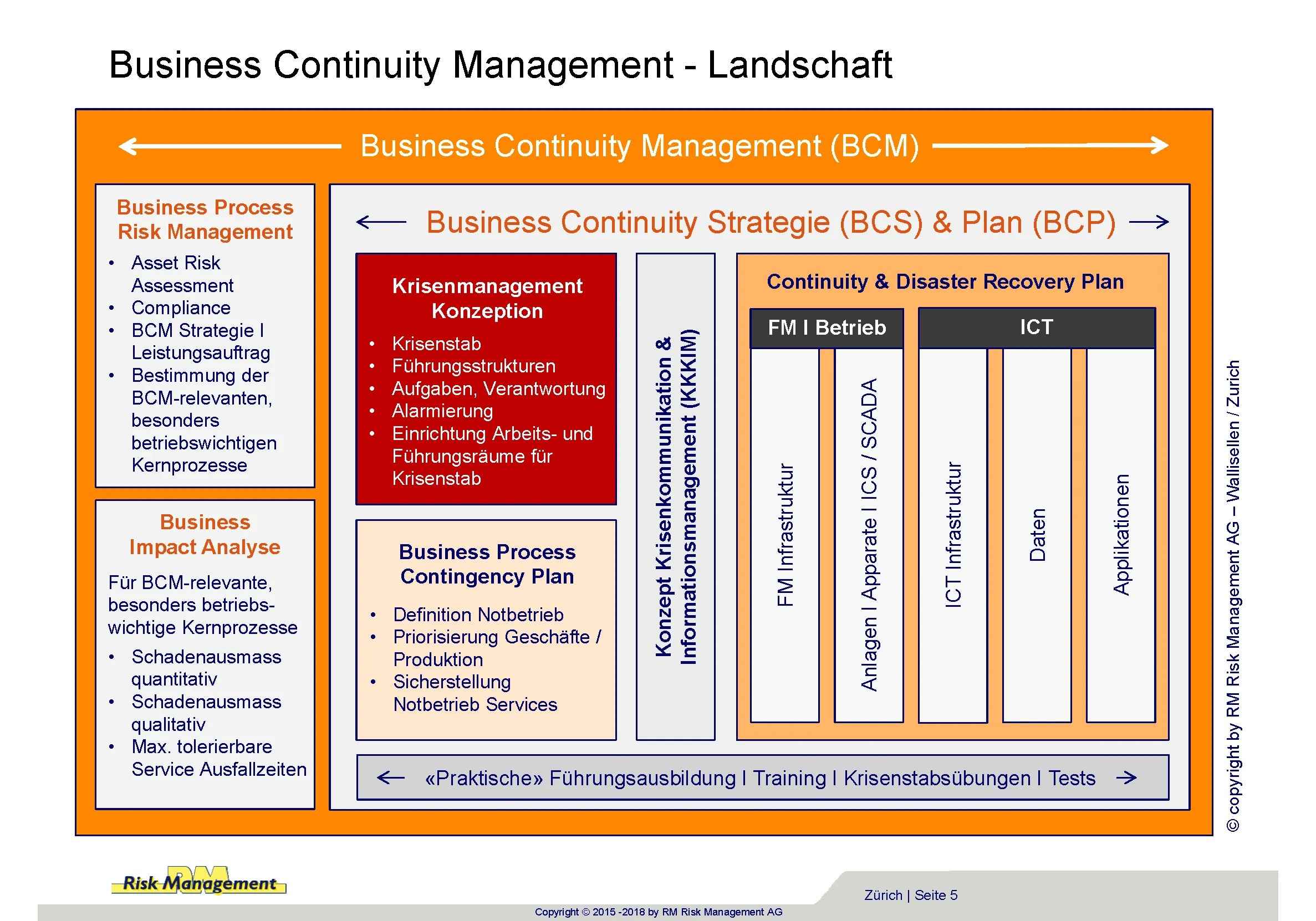 Das Dokument stellt die BCM-Landschaft dar und zeigt die Zusammenhänge von Business Impact Analyse, Continuity- und Recovery-Plänen, Krisenmanagement und Risikobewertung. Es bietet einen Überblick über alle zentralen Komponenten eines wirksamen Business Continuity Managements.