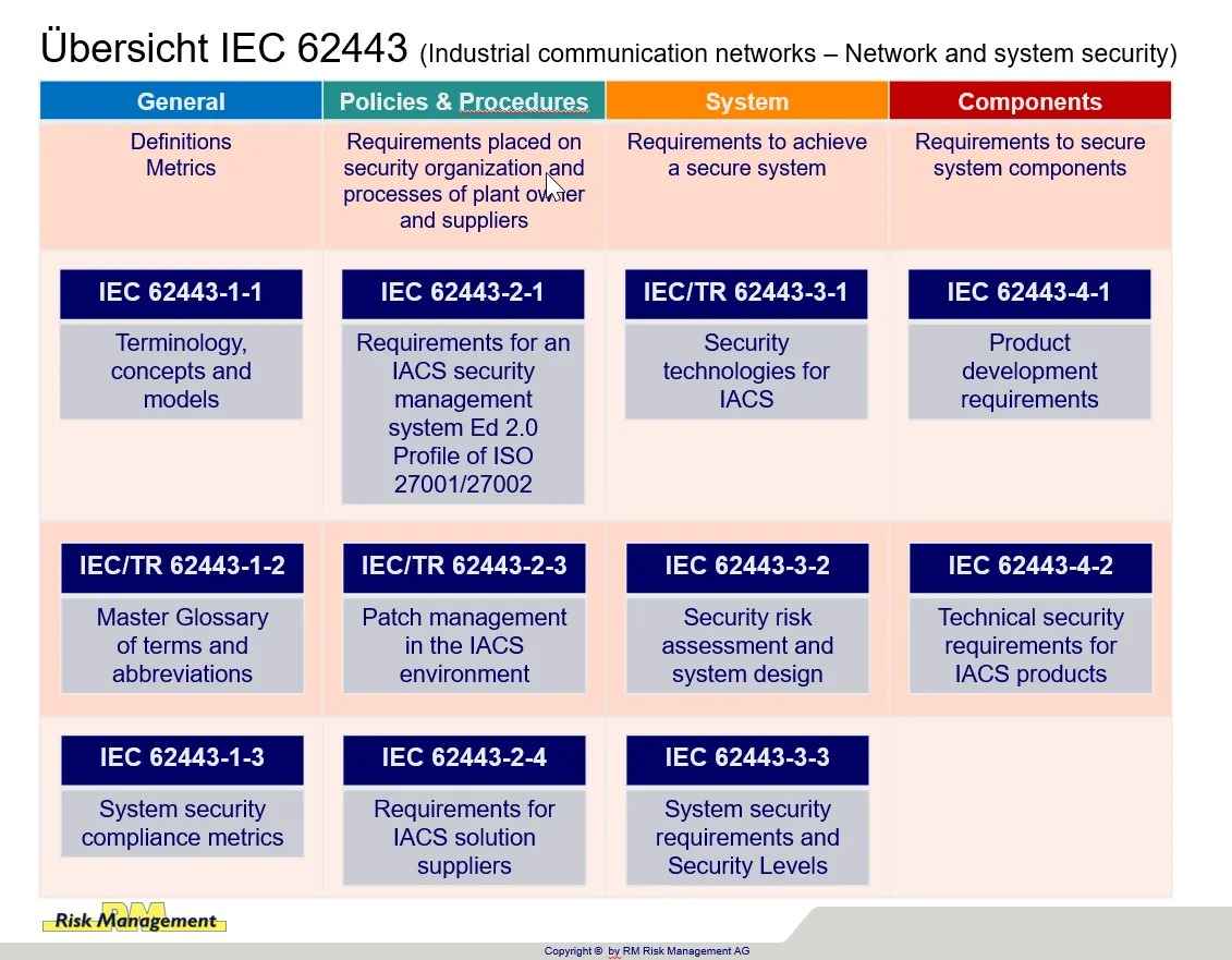 Das Dokument bietet eine Übersicht über die Normenreihe IEC 62443 zur IT- und Netzwerksicherheit in industriellen Systemen. Es erläutert Anforderungen an Organisationen, Systeme und Komponenten sowie relevante Sicherheitsprozesse. Die Normen dienen der Absicherung industrieller Automatisierungs- und Steuerungssysteme (IACS).
